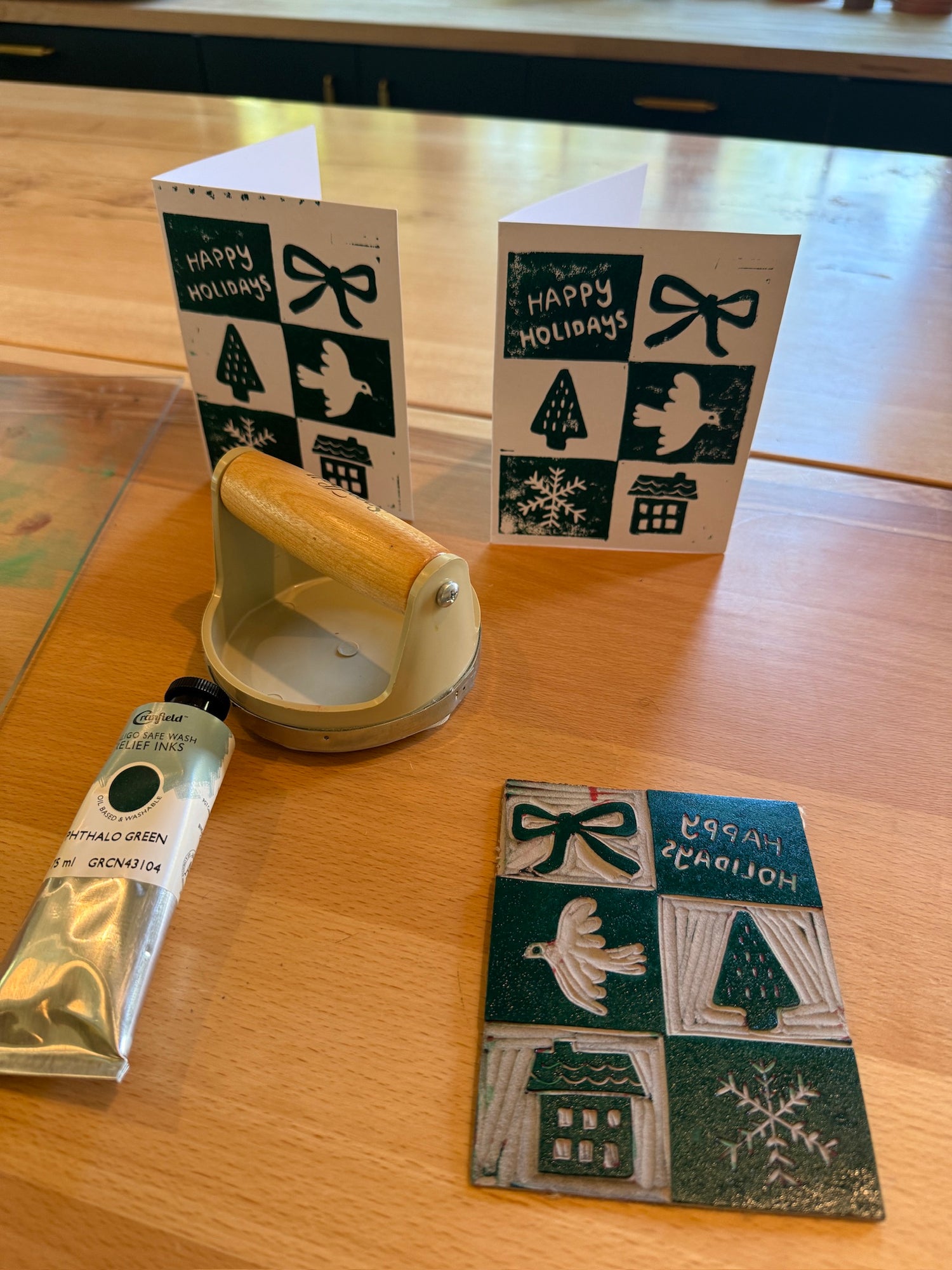 Each participant will make 25 custom cards, included in the class fee, with the option to purchase additional blanks to keep printing with your carved block at home. All materials and tools are provided, and no prior experience is needed. Please bring an idea of what you want to carve and come ready to roll up your sleeves to make something truly one-of-a-kind for the season.