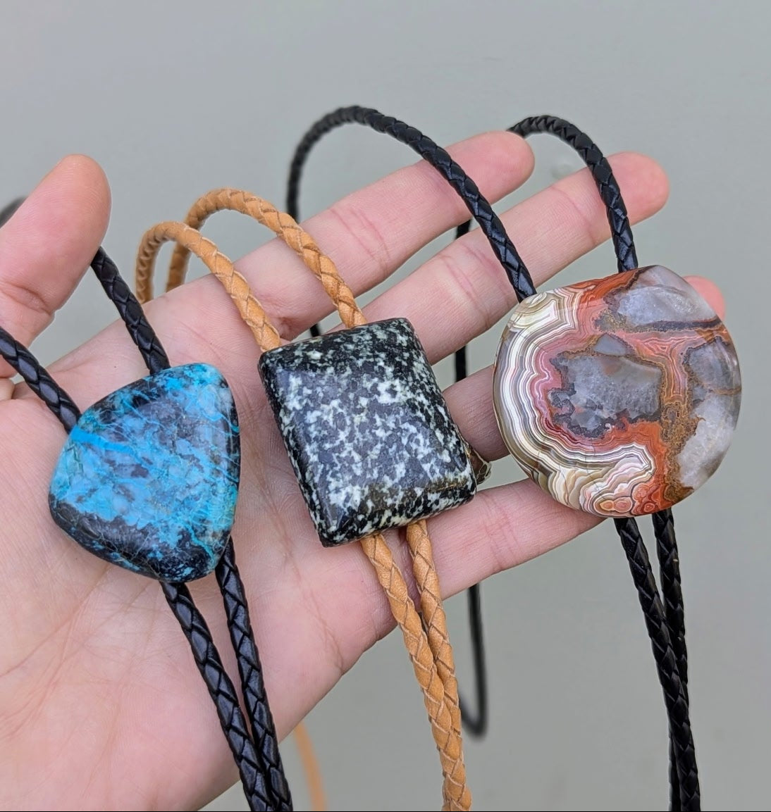 Bolos are a versatile, gender-neutral alternative to neck ties and traditional necklaces. There are a multitude of ways to customize a stone bolo including different shapes, sizes, colors, tip types, etc.. Make one for yourself or someone else...Father's Day gift, anyone?